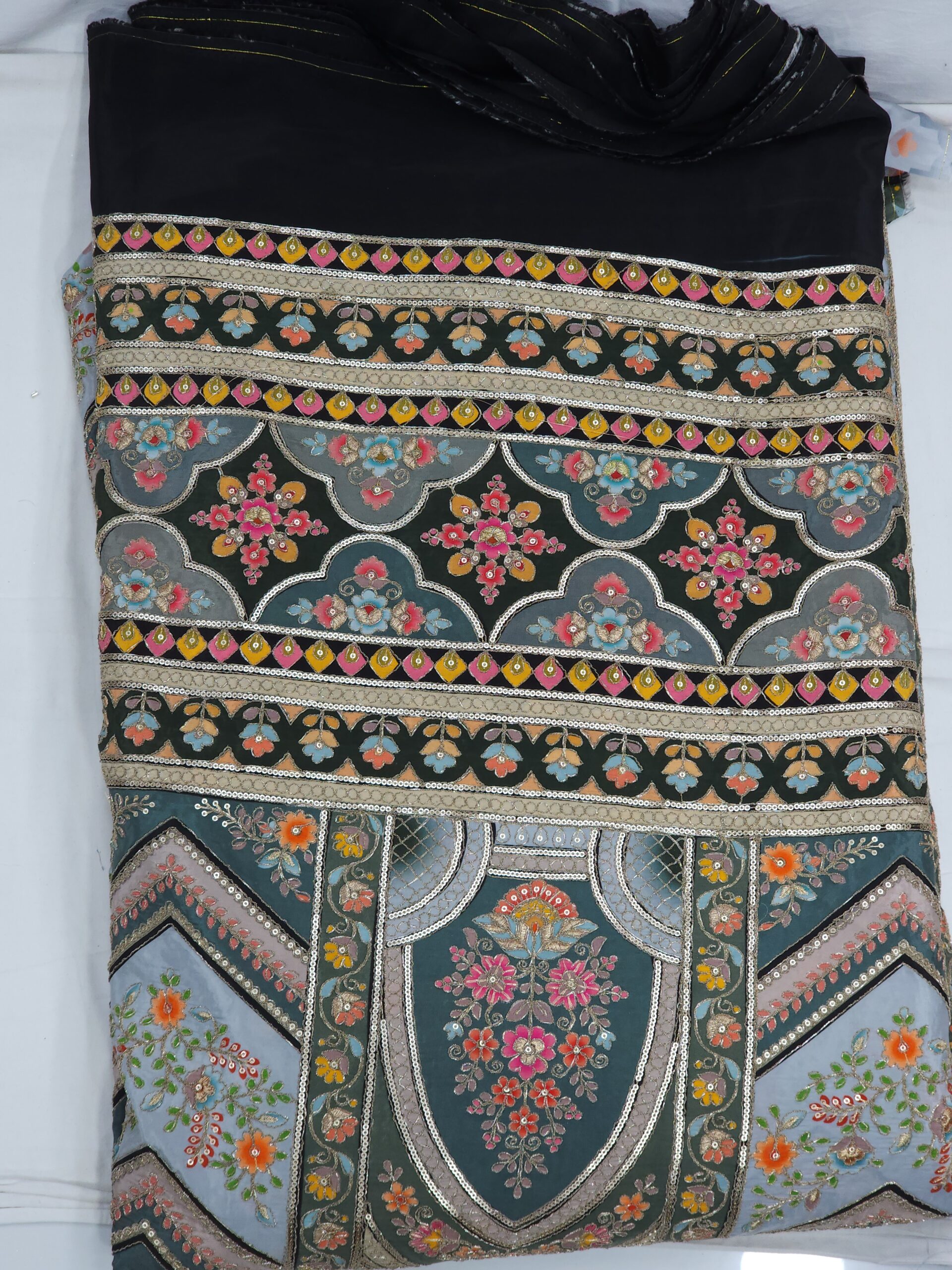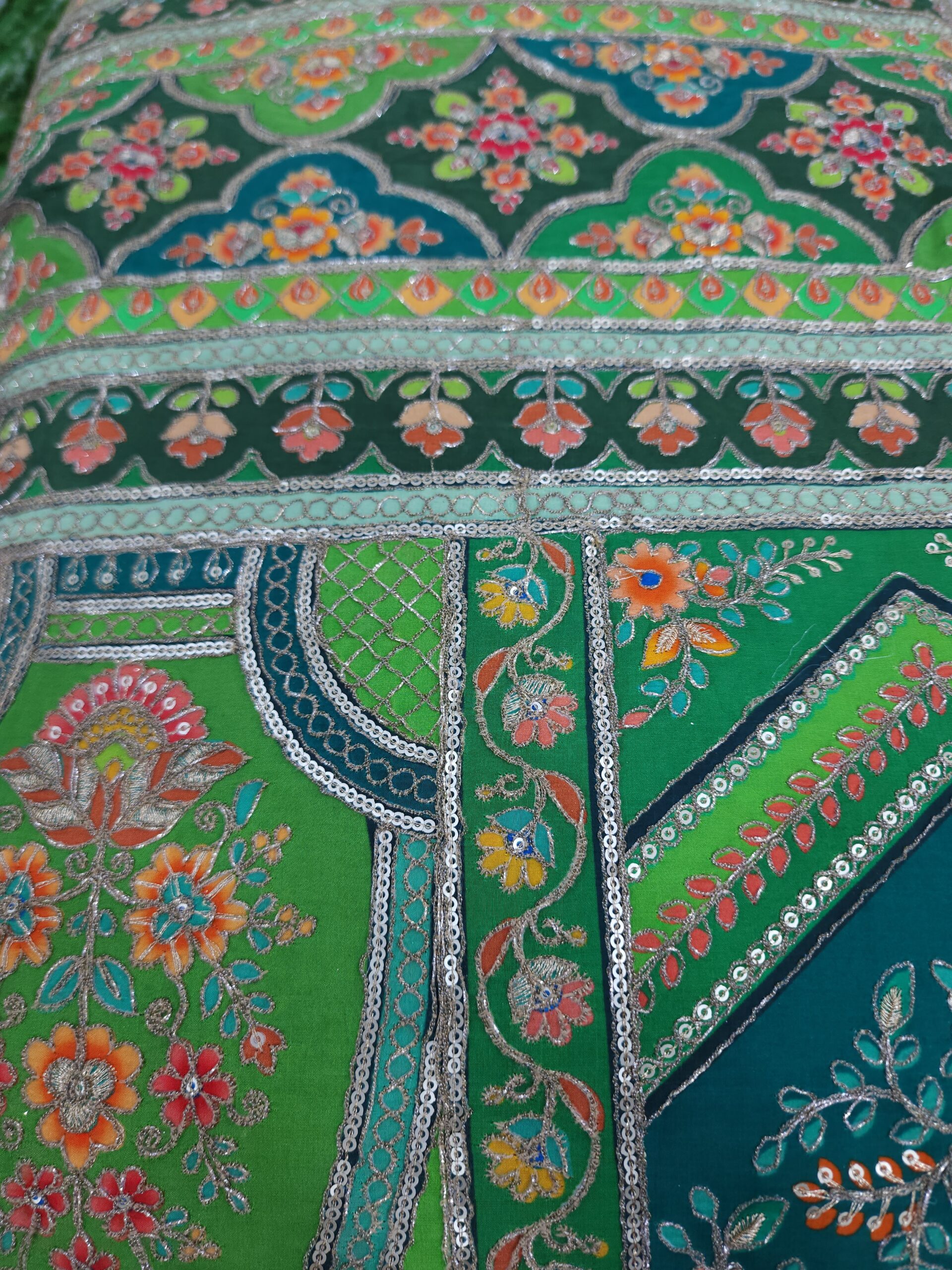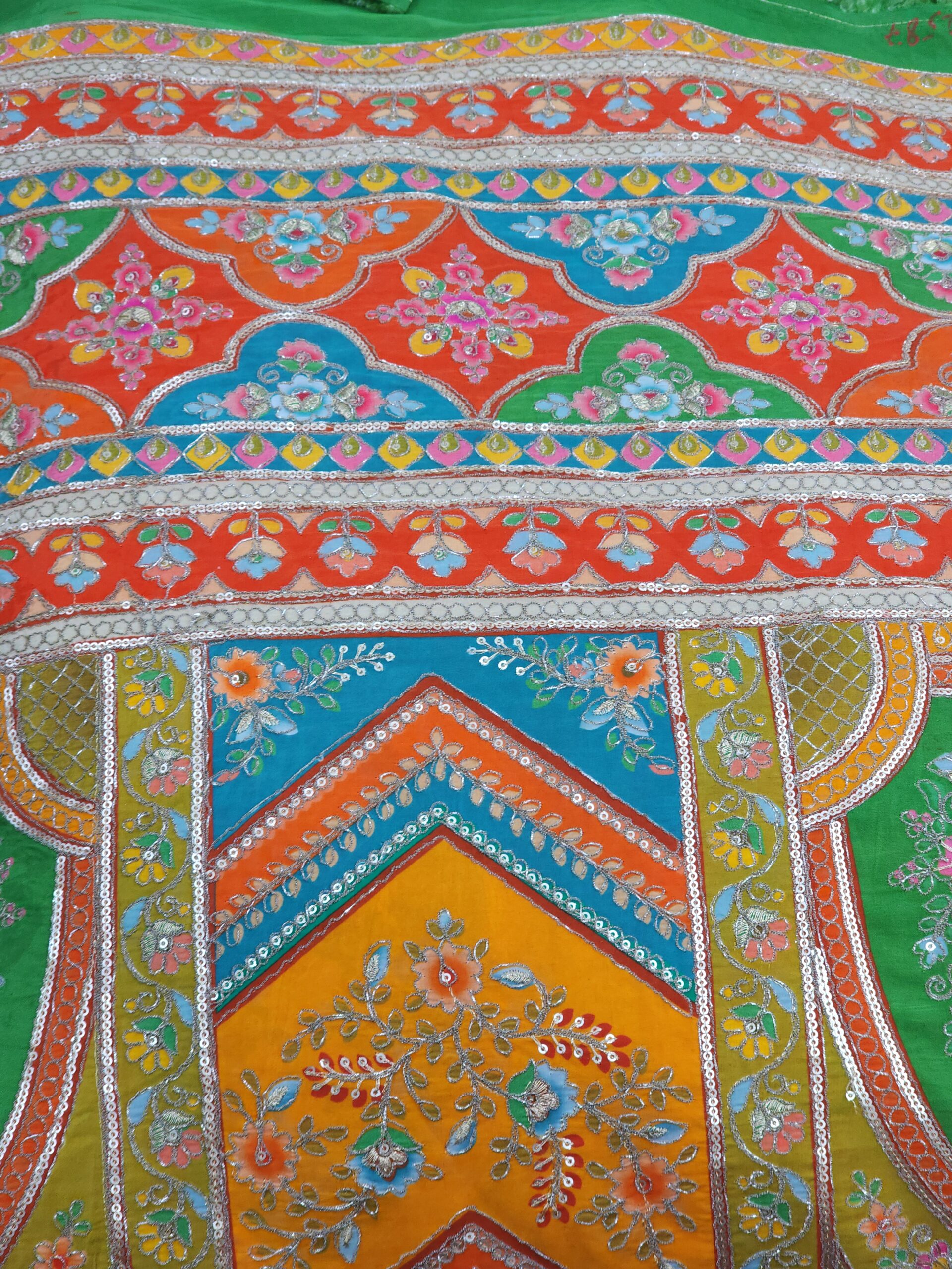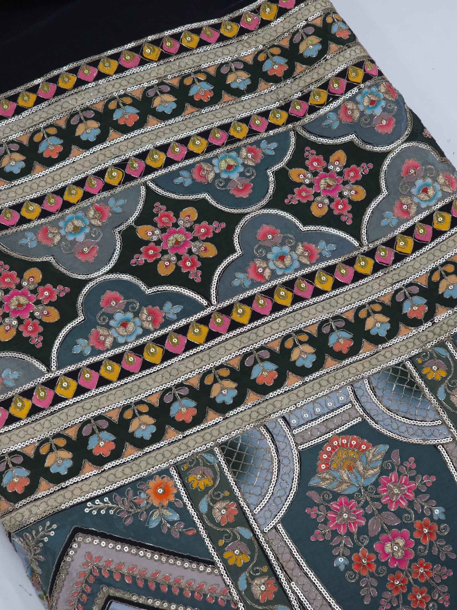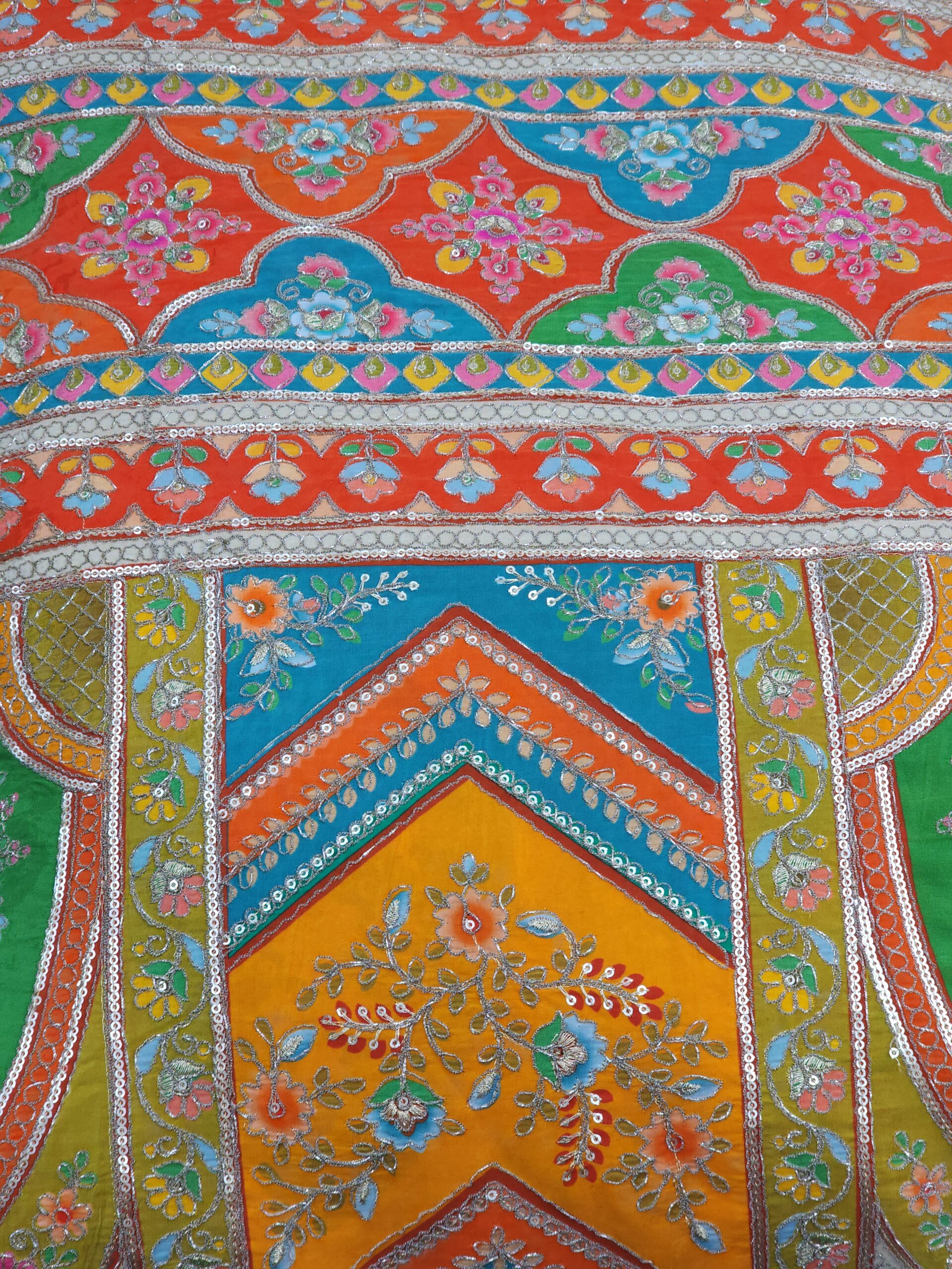 Rich geometric chevron & panel patterns interspersed with flowers