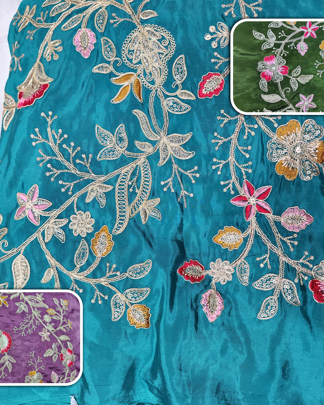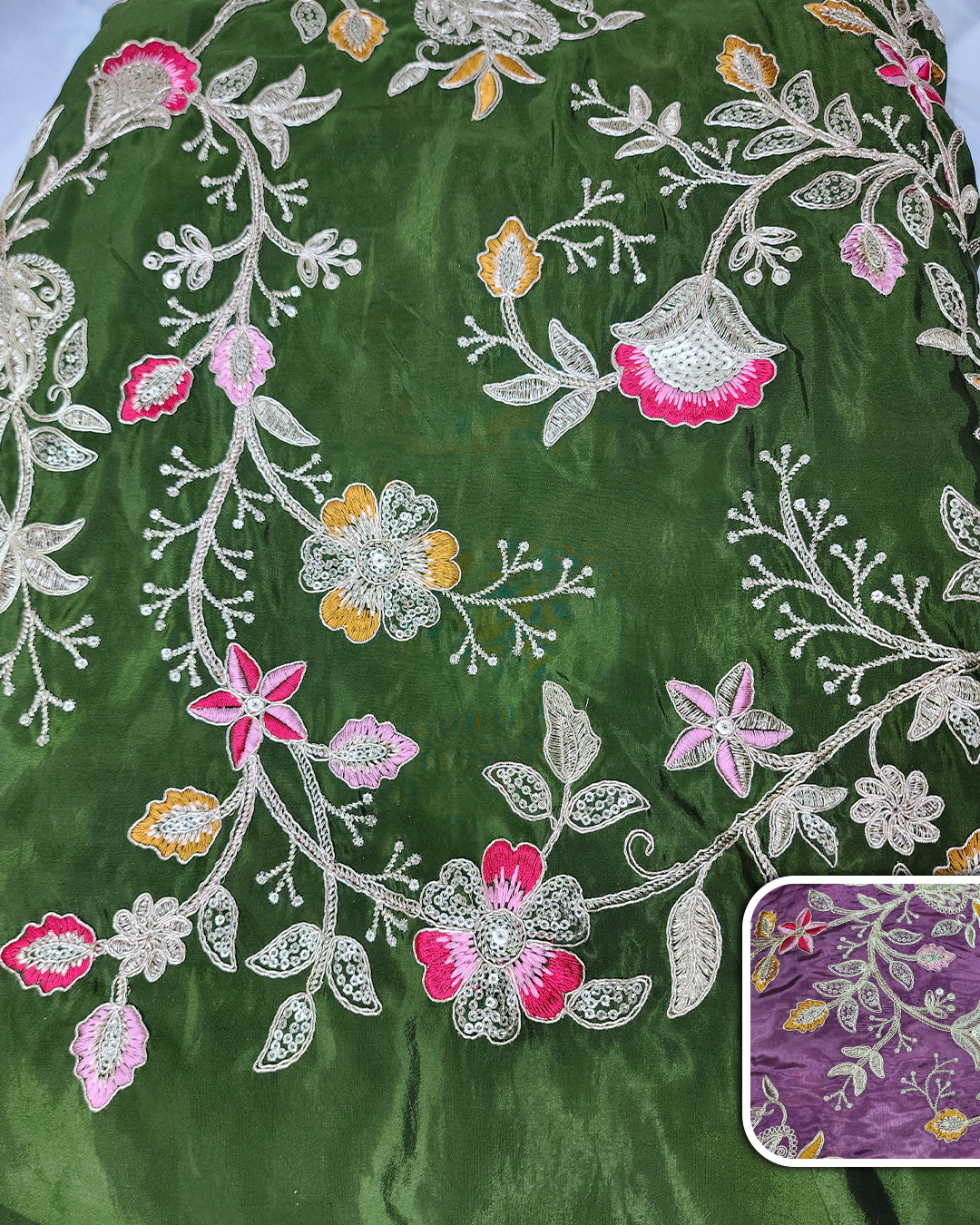 | Work / Embellishment | Comprehensive embroidery + possibly sequins/cut‑work/thread work. The motifs are large and detailed; edges/hem may have heavier work (borders). |